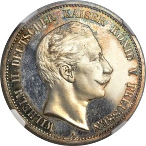 This specimen was lot 24068 in Heritage sale 3024 (Chicago, April 2013), where it sold for $2,585. The catalog description[1] noted, "Prussia. Wilhelm II Proof 5 Mark 1907-A, PR66 Cameo NGC, an elite grade designation for this large type with an attractively frosted central design and original blue-green and russet-gold toning around portions of the legends." This type was struck 1891-1908.