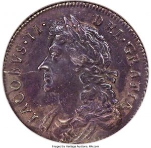 This specimen was lot 31093 in Heritage sale 3073 (Chicago, April 2019), where it sold for $960. The catalog description[1] noted, "James II Shilling 1685 AU55 NGC, Quite simply fascinating to find so well-preserved, one of only a handful of survivors to be certified at this level, with a mere 3 pieces reaching the Mint State level between NGC and PCGS combined. While highly subdued on the obverse, the tiniest bit of friction visible on the king's nose the strike appears an admirable achievement, forming radiant flow lines between the legends and rims in portions, and even breaking the die on the B of IACOBVS. Notably original despite some minimal rub, and fully alluring as such. Ex. Grosvenor Collection. From the Lake County Collection." This type was struck 1685-88 during James's short reign. Later shillings of William III are much more common.