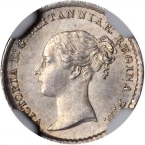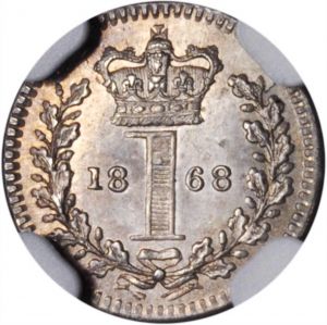 This specimen was part of lot 6619 in Stack's Bowers NYINC sale (New York, January 2017), which sold for $376. The catalog description[1] noted, "GREAT BRITAIN. Maundy Set, 1868. NGC MS-63 (1), 64 (1) & 65 (2). Nice even tone, an attractive set. From the Q. David Bowers Collection. Ex: Baldwins Sale #77 09/2012, Lot #2832." This type, KM 727, was struck 1838-87 for Maundy sets only tho this date is common.