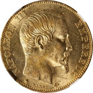 This specimen was lot 70747 in Stack's Bowers Collector's Choice sale (Costa Mesa, CA, June 2022), where it sold for $432. The catalog description[1] noted, "FRANCE. 20 Francs, 1859-BB. Strasbourg Mint. Napoleon III. NGC MS-62. A rather enchanting and glistening nearly-choice example of the type, and one that would serve as an excellent representative of the type." This type is one of the most common gold coins in existence (146 million minted 1853-60) yet it is very difficult to assemble a set in choice condition.