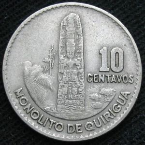 The specimen shown is from a type struck for Guatemala 1965-70. Guatemala still issues ten centavo pieces with the "Monolito de Quirigua" (the monolith of Quirigua, a Mayan stele). As occurred in the United States, the composition was changed from silver to base metal alloy in 1965.