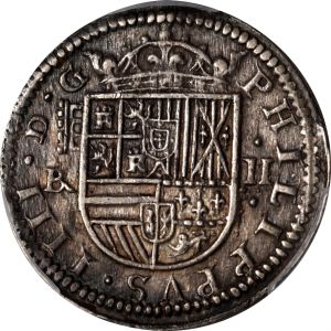 This specimen was lot 75391 in Stack's Bowers Collector's Choice sale (Costa Mesa, CA, February 2022), where it sold for $336. The catalog description[1] noted, "SPAIN. 2 Reales, 1652-B. Segovia Mint. Philip IV. PCGS AU-53. A quite decently struck example of the type, with a slightly eroded reverse die, exhibiting problem-free surfaces and medium to dark gray toning throughout." This type was struck at Segovia (shown here), Toledo and Seville in 1627-28, 1652, 1659. This is the most common date of a fairly scarce type. Numerous overdates exist, suggesting the recycling of many leftover dies.