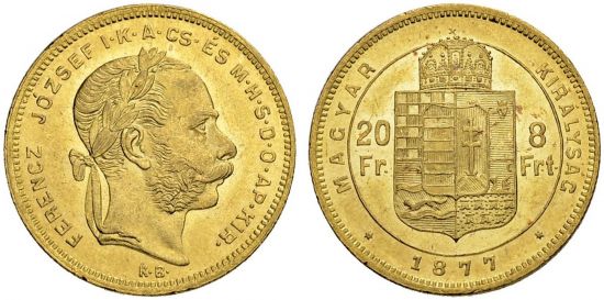 "HOLY ROMAN EMPIRE - AUSTRIA, Franz Joseph I. 1848-1916 8 Forint-20 Francs 1877. Kremnitz. Gutes vorzüglich. ((Kingdom of Hungary, Francis Joseph I, 1848-1916, eight florins or twenty francs of 1877, Kremnitz mint. Good extremely fine.)"