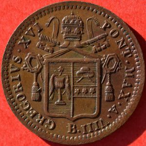 This type is listed for 1835-45 and was struck in Rome and Bologna (shown here). It is among the common Papal copper coins of the nineteenth century; the SCWC does not award any date a premium. The early coinage of the Papal States used an antique monetary system. After 1830, five quattrini = one baiocco; 100 baiocchi = one scudo. In 1866, the currency was reformed to use centesimi and lire in order to match that of the surrounding kingdom of Italy. In 1870, the Papal States were occupied and annexed by the kingdom of Italy and coinage ceased until 1929.