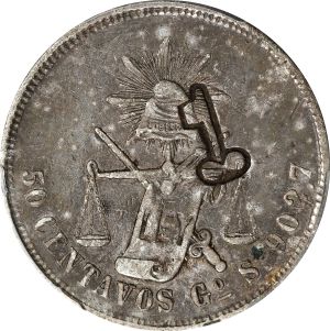 The first specimen is a Bolivian portrait eight reales of 1813 counterstamped in 1834 for circulation in Portugal. It was valued there at 870 réis. A wide variety of pesos served as hosts for this counterstamp; the SCWC lists 44 different undertypes and there are likely more. The one shown here is one of the common hosts. The second specimen was lot 22897 in Stack's Bowers ANA sale (Anaheim, CA, August 2016), where it sold for $211.50. The catalog description[1] noted, "PORTUGAL. 870 Reis, ND (1834). NGC VF Details--Excessive Surface Hairlines. Crowned Arms of Portugal countermarked on an 1801 Mexican 8 Reales. Cleaned, but with a crisp clear countermark. For the type, a very presentable example." The third specimen was lot 8669 in Stack's Bowers NYINC sale (New York, January 2022), where it sold for $312. The catalog description[2] noted,
