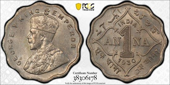 This specimen was lot 2909 in Stephen Album sale 37 (Santa Rosa, CA, June 2020), where it sold for $71.40. The catalog description[1] noted, "BRITISH INDIA: George V, 1910-1936, 1 anna, 1930 (c), PCGS graded MS63." This one anna was struck at the Calcutta mint as part of a type struck 1912-36. The denomination was introduced in 1906 and struck until the end of the Raj in 1947.
