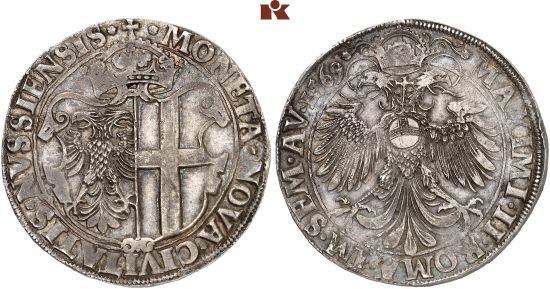 "NEUSS, STADT, Reichstaler 1569, mit Titel Maximilians II. Selten in dieser Erhaltung. Hübsche Patina, leichte Prägeschwäche, fast vorzüglich. Exemplar der Auktion Westfälische Auktionsgesellschaft 2, Dortmund 1993, Nr. 1292. (city of Neuss, thaler of 1569, struck in the name of Maximilian II. Scarce in this quality, handsome patina, slightly weakly struck, about extremely fine.)"