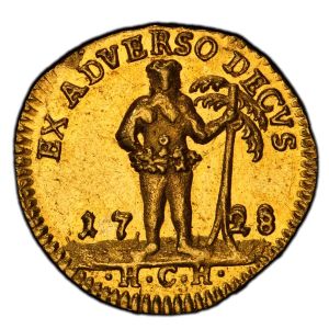 This specimen was lot 30191 in Stack's Bowers ANA sale (Chicago, August 2022), where it sold for $1,800. The catalog description[1] noted, "GERMANY. Brunswick-Luneburg: Brunswick. 1/4 Ducat, 1728-HCH. Brunswick Mint. Ludwig Rudolph (as Prince of Blankenburg). PCGS MS-63. An EXTREMELY RARE fractional gold issue, this shimmering specimen must undoubtedly be one of the finest extant. The strike is crisp and quite clear, and the luster radiates throughout. The nav[e]l of the wildman, rather interestingly, is quite pronounced, and the only real aspect needing to be mentioned is the slight planchet flaw at the upper left edge of the obverse. From the Robert C. Knepper Collection." Altho the wild man appears on many series of North German thalers, he rarely appears on gold coins. This scarce type is listed for Brunswick-Blankenburg for 1728 only altho some come undated. The duke succeeded to Brunswick-Wolfenbüttel in 1731 and merged the two duchies, ending the -Blankenburg series.