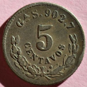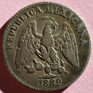 Shown is an 1889GaS five centavos, of a type struck 1877, 1881 and 1886-93. This issue from Guadalajara is a scarce date. Other mints include Hermosillo, Culiacan, Durango, Zacatecas, Chihuahua, Guanajuato, Mexico City, Alamos, Oaxaca and Potosi.