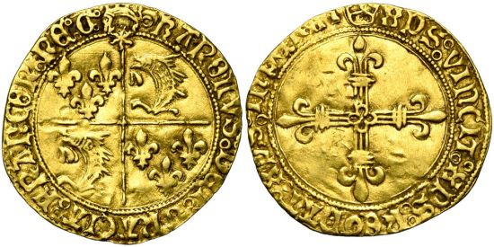"FRANCE, Royaume, Charles VIII (1483-1498), AV écu d'or au soleil du Dauphiné, point 2e, Romans. 1er type. D/ Champ écartelé de France-Dauphiné, sous un soleil et un dauphin. R/ Croix fleurdelisée. Rare. Très Beau. Provient de notre vente 80, 12 juin 2004, 1057. (kingdom of France, Charles VIII, 1483-98, gold écu of the sunburst of Dauphiné, second point, Romans mint, first type. Obverse: quartered arms of France and Dauphiné under a sunburst and a dolphin; reverse: floriate cross. Rare, Very Fine.)"