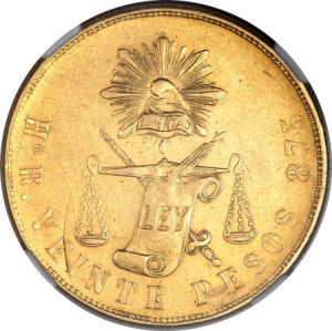 This specimen was lot 31340 in Heritage sale 3035 (Long Beach, September 2014), where it did not sell. The catalog description[1] noted, "Republic gold 20 Pesos 1875 Ho-R AU53 NGC, Hermosillo mint. A tad softly struck but an unusually well preserved specimen of this fabled rarity, one of the key issues of this entire series: only limited wear appears on the higher points of the design, while the overall appearance remains most pleasant. Likely the 2nd finest specimen of this legendary issue, slightly behind the AU55 coin recently offered by us. From The FoxLair Collection." This type was struck at Hermosillo 1874-76 and 1888 and is a rare mint. There are no common gold coins from Hermosillo.