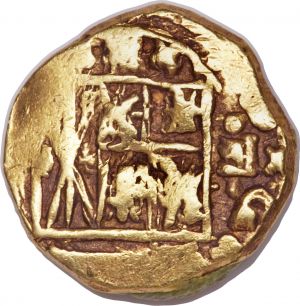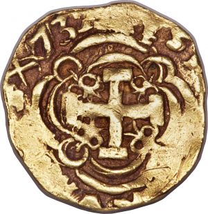 This specimen was lot 29536 in Heritage sale 3042 (Long Beach, September 2015), where it sold for $910.63. The catalog description[1] noted, "Philip V gold Cob 2 Escudos 1732 SF-(M) Fine, Santa Fe mint. Wholesome with most details clear, including the full 3-digit date on the reverse. Rare and quite desirable since with the aforementioned clear date and unflawed." This type was issued from Bogotá 1717-46. Specimens with legible dates are worth double those without. Many have been made into jewelry and sold as "pirate gold."
