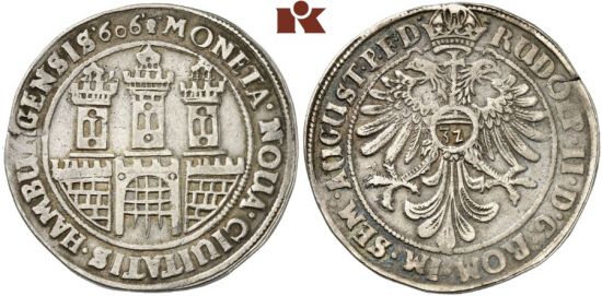 "Hamburg, STADT Reichstaler (32 Schilling) 1606, mit Titel Rudolfs II. Münzmeister Matthias Moers. Hübsche Patina, winz. Schrötlingsfehler am Rand, sehr schön. (Germany, city of Hamburg, thaler of 1606, in the name of Rudolf II, mintmaster Matthias Moers. Rare, nice patina, edge crack, very fine.)"
