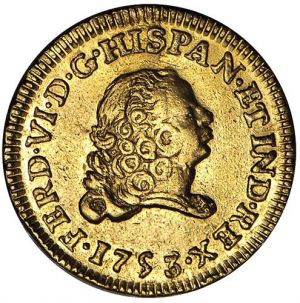 This specimen was lot 1174 in Stack's "Vermuele, Ward & Mexico Maxico" sale (New York, January 2010), where it sold for $718.75. The catalog description[1] noted, "MEXICO. Fernando VI, 1746-1759. 1 Escudo, 1753/2 Mo MF. Mexico City. Small bust r., tall-letter legend and date. Rv. Crowned shield, NOMINA MAGNA SEQUOR, I Follow Great Names. Full strike. Choice Very Fine. From the Mexico Maxico (Magical Mexico) Collection." All Mexican colonial gold may be considered scarce. This type was struck 1752-56 and is the second of three types featuring Ferdinand VI, who died in 1759. The SCWC does not award the overdate a premium; the type is too rare for most collectors to collect by date.