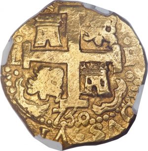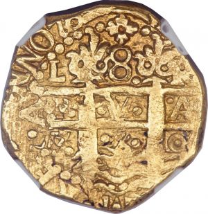 This specimen was lot 30327 in Heritage sale 3040 (Chicago, April 2015), where it sold for $5,405. The catalog description[1] noted, "Ferdinand VI gold Cob 8 Escudos 1750 L-R AU55 NGC, Lima mint, Lustrous with little actual high-point wear albeit double struck and thus with blurry details on the obverse. Probably from the "La Luz" shipwreck albeit not identified as such on the insert. A popular and elusive issue, rare in this technical designation." This type is recorded for 1747-50. The Mexico City mint was converted to milled coinage in 1732-34 but Lima would not follow suit until 1751.