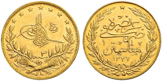 "OSMANISCHES REICH | Muhammad V., 1327-1336 H./1909-1918 AD, 100 Kurush 1327 H./Jahr 3, Manâstir. Tughra neben monogrammiertem reshâd über dem Regierungsjahr auf Lorbeerzweigen und Pfeilköchern, Münzstättenangabe und Datum des Regierungsanfangs. FDC. (Turkey, Muhammed V, 1909-18, gold hundred kurush of AH 1327, year 3, Monastir mint. Obverse: Tughra next to monogrammed reshâd over the regnal year on laurel branches and quivers, reverse: mintmark and accession date. Uncirculated.)"