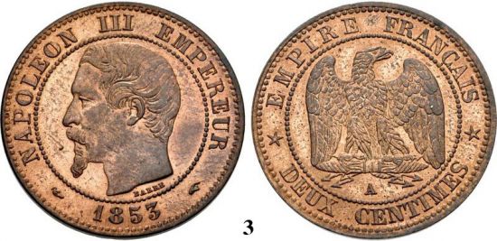 This specimen was part of lot 466 in Classical Numismatic Group's sale of the Lissner Collection (Chicago, July 2014), where it sold for $786.50. The catalog description[2] noted, "FRANCE, Empire. Lot of eight (8) CU and AR Denominations. Lot includes the following denominations: ...Second Empire. Napoléon III. 1852-1870. CU 2 Centimes à la tête nue, Paris mint; différents: dog’s head and hand. Jacques-Jean Barre, engraver general. CH.-Louis Dierickx, director. Dated 1853 A. In NGC encapsulation graded MS 65 RB. Gem mostly red with great eye appeal...." The regime of Napoleon III finally carried out plans developed during the 1840's to melt down and remint all the old copper circulating in France, some of it dating back to before the Revolution of 1789. Several branch mints were reopened for this purpose. The existing mints were Paris ("A"), Strasbourg ("BB") and Bordeaux ("K"); the reopened mints were Lille ("W"), Marseilles ("MA"), Rouen ("B") and Lyon ("D"). The two centimes is the scarcest of the bronze denominations of Napoleon III, tho it is not rare.