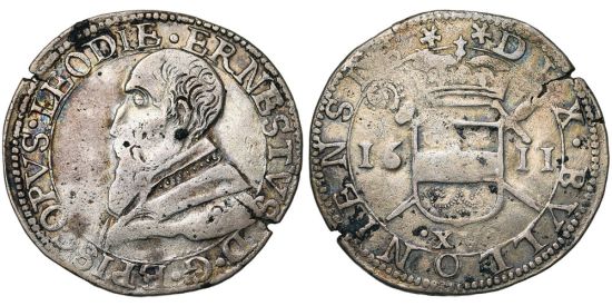 "LIEGE, Principauté, Ernest de Bavière (1581-1612), AR teston de 15 patards, 1611, Bouillon. Premier type à la petite tête. D/ B. à g., vêtu d'un manteau d'hermine. R/ Ecu de Bouillon couronné, posé sur une crosse et une épée en sautoir, entre 16-11. En dessous, la valeur ·XV·. Extrêmement rare. Beau à Très Beau. Provient de la collection A. Symkens, 25 novembre 1991. (principality of Liège, Ernest of Bavaria, 1581-1612, silver teston of fifteen patards of 1611, Bouillon mint, first type with the small head. Obverse: bust of the prince-bishop to left in an ermine mantle; reverse: crowned arms of Bouillon over a cross and a sword, the date above and the value below. Extremely rare, Fine - Very Fine.)"