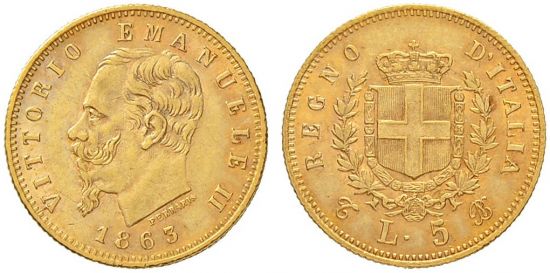 This type was struck at the Turin mint 1863 and 1865 during the reign of Victorio Emanuele II of Italy. It is struck to the same standard as the contemporary French gold five francs. It was abandoned after 1865 and is today scarce. Several countries, including Italy, were striking large numbers of silver crowns (worth about three francs in bullion) and redeeming them in France for five francs in gold.