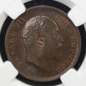 This specimen was lot 2744 in Stephen Album sale 38 (Santa Rosa, CA, September 2020), where it sold for $107.10. The catalog description[1] noted, "BRITISH INDIA: Edward VII, 1901-1910, AE ¼ anna, 1910(c), gorgeous iridescent luster, NGC graded MS65 BR." This quarter anna was struck at the Calcutta mint 1906-10. The weight was reduced from 6.48 g in 1906 and thence to 4.72 g in 1912. A quarter anna was one sixty fourth of a rupee.