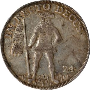 This specimen was lot 74544 in Stack's Bowers Collectors Choice sale (Costa Mesa, CA, September 2023), where it sold for $144. The catalog description[1] noted, "GERMANY. Brunswick-Luneburg: Hannover. 24 Mariengroschen (2/3 Taler), 1714-HH. Zellerfeld Mint. Georg Ludwig (George I of Great Britain). PCGS AU-53. Mostly slate gray throughout, this handsome survivor presents an even deeper nature nearer the peripheries. From the Robert C. Knepper Collection." This type was struck 1712-15 and is fairly common. In 1714, Georg Ludwig ascended the throne of Great Britain and all the Hanoverian coinage was revised to show his new title the next year.