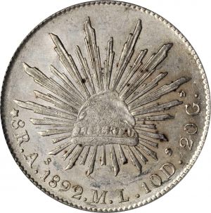 This specimen was lot 23382 in Stack's Bowers ANA sale (Philadelphia, August 2018), where it sold for $65. The catalog description[1] noted, "MEXICO. 8 Reales, 1892-AsML. PCGS AU-55 Secure Holder. A touch of softness appears in the centers." The Alamos mint struck eight reales 1864-95. Many of the early dates are rare but this one is fairly common.