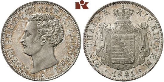 "SACHSEN-ALTENBURG, HERZOGTUM Josef, 1834-1848. Taler 1841. Selten in dieser Erhaltung. Feine Patina, vorzüglich-Stempelglanz. (Germany, duchy of Saxe-Altenburg, Joseph, 1834-48, thaler of 1841. Rare in this grade, fine toning, extremely fine to uncirculated.)"