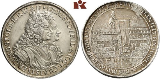"STOLBERG-STOLBERG UND STOLBERG-ROSSLA, GRAFSCHAFTEN (DIE JÜNGERE STOLBERGER HAUPTLINIE AUS DER TEILUNG VON 1645) Christof Friedrich zu Stolberg-Stolberg und Jost Christian zu Stolberg-Rossla, 1704-1738. Reichstaler 1717, Stolberg, auf die 200-Jahrfeier der Reformation. Ausbeute der Stolberger Gruben. RR Feine Patina, min. berieben, sonst sehr schön +. (counties of Stolberg-Stolberg and Stolberg-Rossla, joint issue, thaler of 1717, Stolberg mint, on the bicentennial of the reformation, for the Stolberg mines. Rare, toned, polished, otherwise nice very fine.)"