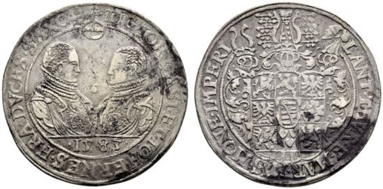 "Sachsen-Coburg-Eisenach, Herzogtum, Johann Kasimir und Johann Ernst II. 1572-1633 Taler 1583. Saalfeld. Sehr schön. (Germany, duchy of Saxe-Coburg-Eisenach, John Casimir and John Ernest II, 1572-1633, thaler of 1583, Saalfeld mint. Very fine.)"