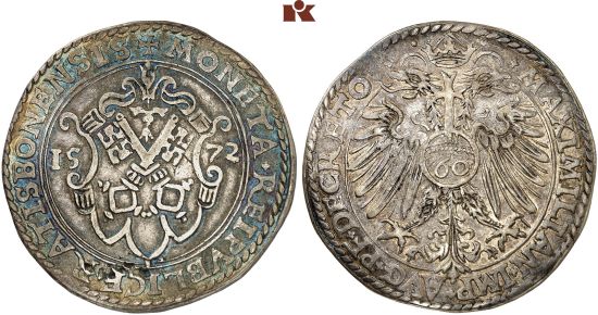 "DIE REICHSSTADT REGENSBURG. DIE ZEIT DES KAISERS MAXIMILIAN II., 1564-1576. Guldentaler (60 Kreuzer) 1572, mit Titel Maximilians II. Münzmeister Thomas Obermeier. Von größter Seltenheit. Hübsche Patina, kl. Schrötlingsfehler, sehr schön. (city of Regensburg, guldenthaler of sixty kreuzer of 1572, struck in the name of Maximilian II. Extremely rare, handsome patina, minor planchet defects, very fine.)"