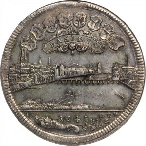 The second specimen was lot 1618 in Stack's Bowers ANA auction (Chicago, August 2014), where it sold for $1,938.75. The catalog description[2] noted, "SWITZERLAND. Basel. 2 Taler, 1741. NGC EF-45. A popular type, featuring a city view. Pleasing gray surfaces." The SCWC notes this rare type for 1741 only. This is the last double thaler listed for Basel and is accompanied by a single thaler (Dav-1750).
