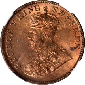 This specimen was lot 74354 in Stack's Bowers Collector's Choice sale (Costa Mesa, CA, February 2022), where it sold for $360. The catalog description[1] noted, "INDIA. Mint Error -- Struck Through Obverse -- 1/4 Anna, 1929-(C). Calcutta Mint. George V. NGC MS-64 Red. A very attractive mint error that offers clear evidence of the strike through on the obverse. Blazing mint red adorns this piece, making it one of the finest examples of the type, error or otherwise." This quarter anna was struck at the Calcutta mint after World War One. The type was struck 1912-36 and is common in all grades but still makes a handsome coin in nice condition. The Bombay mint also struck this type but only in 1924-28, 1930 and 1936. A quarter anna was one sixty fourth of a rupee.