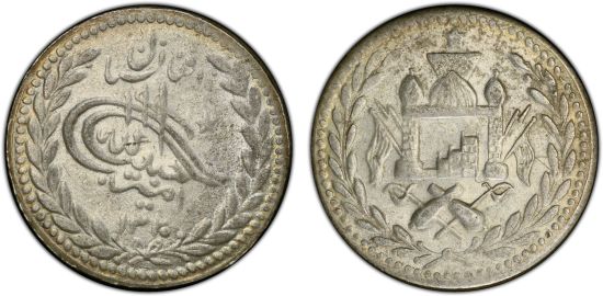This specimen was lot 3537 in Stephen Album sale 50 (Santa Rosa, CA, September 2024), where it sold for $120. The catalog description[1] noted, "AFGHANISTAN: Habibullah, 1901-1919, AR rupee, AH1320, an attractive lustrous example, PCGS graded MS62, ex Hakim Hamidi Collection." Milled coinage was introduced to Afghanistan during the reign of Abdur Rahman (1880-1901). This type was struck AH 1319, 1320 and 1325. Each die was handmade, so many varieties exist.