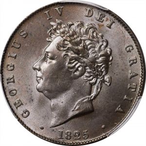 This specimen was lot 72104 in Stack's Bowers Collector's Choice sale (Santa Ana, CA, October 2019), where it sold for $360. The catalog description[1] noted, "GREAT BRITAIN. 1/2 Penny, 1825. London Mint. George IV. PCGS MS-64 Brown Gold Shield. Tied with just two other specimens for the finest certified by PCGS, this deep chocolate-brown near Gem features captivating surfaces and immense luster. Tremendous eye appeal is on full display. From the Regent Crest Collection." This type was struck for George IV 1825-27 and was the first half penny struck since 1806. This is the scarcest of the three year type.