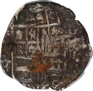 This specimen was lot 71091 in Stack's Bowers Collectors Choice sale (Costa Mesa, CA, November 2022), where it sold for $504. The catalog description[1] noted, "BOLIVIA. Cob 4 Reales, 1646-P. Potosi Mint; Assayer Geronimo Velasquez (V/T). Philip IV. PCGS Genuine--Environmental Damage, VF Details. A rough example, this Cob is extensively scratched and corroded. It is nonetheless a VERY RARE issue, displaying the V/T over-assayer mark. One of the conspirators implicated in the 1649 Potosi Mint Scandal (and subsequently executed), coins of Geronimo Velasquez are exceptionally rare. While the final digit of the date is unreadable, the presence of the assayer initial 'V' means this coin could only have been minted in 1646. The obverse is in poor condition and dramatically doubled, but the reverse retains comparatively neat castles and lions along with the legend 'ANO 164'. An almost impossible to acquire date and over-assayer, this coin is a remarkable survivor despite its shortcomings. From the Pat Johnson Collection. Ex: Paul Karon Collection (Ponterio 42 - 03/1990) Lot # 336. Ex: Sellschopp Collection (Swiss Bank Corp - 09/1988) Lot # 684." The mountains around Potosi contained enormous amounts of high grade silver ore, a situation the Spanish were not slow to exploit. A mint was set up in the 1570's to process the silver mined there. The early products of the reign of Philip II are fairly good quality but rot set in during the following reign, including fraudulent debasement. This type was struck 1622-47, throughout the first part of the reign of Philip IV. Dates were added in 1617; even so, many are so crudely made that the dates are not legible. This type is rare; it was never made in large quantities and nearly all melted down in the great remintage of 1649-52 when the debased cobs were called in. Assayer V operated 1646 only.