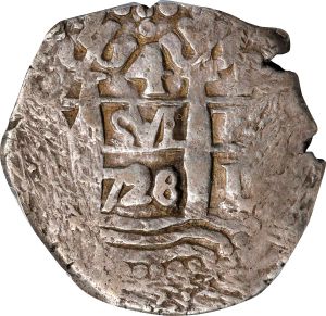 This specimen was lot 72046 in Stack's Bowers Collectors Choice sale (Costa Mesa, CA, November 2022), where it sold for $1,440. The catalog description[1] noted, "PERU. Cob 4 Reales, 1728-L. Lima Mint; Assayer Joaquin Negron y Colmenares (N). Philip V. PCGS VF-35. This piece exhibits minor doubling and some circulation wear, but retains a pleasingly clear date and denomination mark on its obverse. A rather presentable cob overall, enhanced by its attractive toning. From the Pat Johnson Collection. Ex: Sellschopp Collection (UBS Zurich 9/1988) Lot # 227." Four reales of this type were struck through the reign of Philip V. Assayer Negron y Colmenares stamped his coins 1728-38. Specimens with legible dates are scarce. In 1728, the silver cobs were debased from 0.931 fine to 0.917 fine with no change in design. The mintage of gold commenced in 1696.