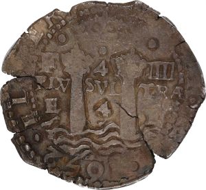 This specimen was lot 235 in Sedwick Treasure Auction 26 (Winter Park, FL, November 2019), where it sold for $505.75. The catalog description[1] noted, "Potosí, Bolivia, cob 4 reales, 1652E post-transitional, 1-PH-6 at top. Full, fat pillars with cute little 1-PH-6 at top below full crown, prominent tressure around full but mostly flat cross, minimal corrosion, deeply toned. Recovered from: Capitana, sunk in 1654 off Chanduy, Ecuador." This type was struck 1652-66 for Philip IV. It superseded the shield/cross type which was involved in the debasement scandal of the 1630's and 1640's. The second specimen was lot 71108 in Stack's Bowers Collectors Choice sale (Costa Mesa, CA, November 2022), where it sold for $1,800. The catalog description[2] noted,