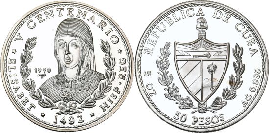 "CUBA, République (1902-), AR 50 pesos (5 oz), 1990. Reine Elisabeth d'Espagne. 2000 p. frappées. Flan poli. (republic of Cuba, silver fifty pesos (five troy oz) of 1990, queen Isabella of Spain, 2000 pieces struck. Proof.)"