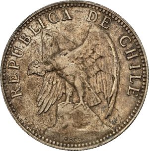 This specimen was lot 851 in Sedwick Auction 36 (Winter Park, FL, November 2024), where it sold for $. The catalog description[1] noted, "CHILE, Santiago, 1 peso, 1896/5, NGC XF 40 (Colección Val y Mexía Label), finest and only example in NGC census. Lightly toned over muted luster, some high-point wear but arguably AU, trace of overdate that is unlisted and probably rare. Pedigreed to the Val y Mexia Collection." The specimen shown is a type struck in Chile 1895-97. It is the first (but not the last) reduction in size from the full-size pesos of the 1890's. The next type, issued 1902-05, was only 20 grams, .700 fine silver. Oscar Roty's defiant condor, first used in 1895, appeared on virtually all Chilean silver and copper-nickel coins until 1940.