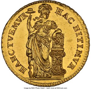 This specimen was lot 34031 in Heritage sale 3106 (New York, January 2023), where it sold for $11,400. The catalog description[1] noted, "Netherlands: Holland. Provincial gold 10 Stuivers (1/2 Gulden) 1756 MS62 Prooflike NGC, Struck to a 3 Ducat weight. An always coveted off-metal striking in gold, especially when encountered with a rarely assigned and fully deserving Prooflike designation. Distinguished by ample mirroring and prominent die polish, with Pallas especially crisp. A clear conditional and aesthetic outlier for the series and one worthy of additional consideration. From the Coenen Collection." The silver version was struck 1748-51 and 1761-62 but seems to have been less popular than the more available one gulden. The gold version is listed for 1734, 1748-49, 1752-56; all dates are extremely rare.
