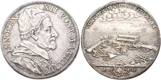 "ITALY | Kirchenstaat. Innozenz XII. 1691-1700. Piastra 1699 / Anno VIII, Roma. Mit dem Hafen von Anzio in der Rückseitendarstellung. Sehr selten. Gutes vorzüglich. NGC AU58. Feine Patina. (Italy, Papal States, Innocent XII, 1691-1700, piastra of the year eight (1699), Rome mint, with the harbor at Anzio on the reverse. Very rare, Good extremely fine, Nicely toned.)"
