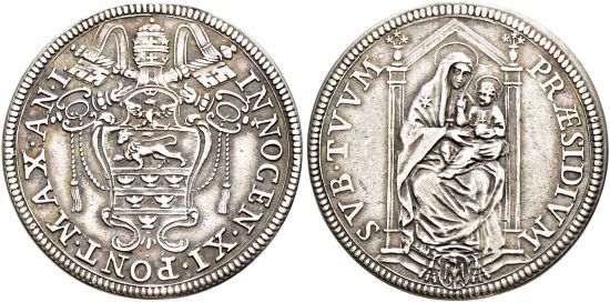 This specimen was lot 2837 in Sincona sale 80 (Zurich, October 2022), where it did not sell. The catalog description[1] noted, "ITALY | Vatican - Church State, Innozenz XI. 1676-1689. Testone Anno I (1676), Roma. Rare, About extremely fine." This one year type is scarce.