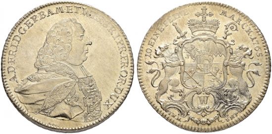 "Würzburg, Bistum, Adam Friedrich von Seinsheim, 1755-1779. Konventionstaler 1765, Würzburg. Selten in dieser Erhaltung. Vorzüglich-FDC. Minimale Kratzer. (Germany, bishopric of Würzburg, Adam Frederick of Seinsheim, 1755-79, convention thaler of 1765, Wurzburg mint. Rare in this condition, Extremely fine-uncirculated, Tiny scratches.)"