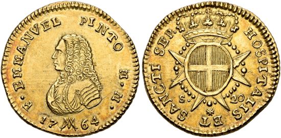"MALTA. Emanuel Pinto, 1741-1773. 20 Scudi 1764, Valetta. Gutes vorzüglich. NGC AU58. (Order of Malta, Emanuel Pinto, 1741-73, twenty scudi of 1764, Valetta. Good extremely fine.)"