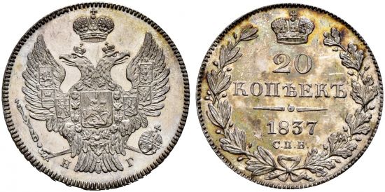 "20 Kopecks 1837, St. Petersburg Mint, SPB NG. Very rare as a proof. Attractive toning. NGC PF65 CAMEO. (20 копеек 1837, СПб МД, СПБ НГ. Биткин 318. Очень редкие в исполнении пруф. Привлекательный оттенок поверхности. В слабе NGC PF65 Cameo.)" Ex auction SINCONA AG 7, Zürich, October 2012, lot 949. (С аукциона Синкона АГ 7, Цюрих, октябрь 2012, лот 949.)"