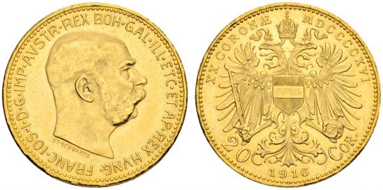 "Franz Joseph I. 1848-1916. 20 Kronen 1916, Wien. Mit Bindeschild. Gutes vorzüglich. Minimal justiert. (empire of Austria, Francis Joseph I, 1848-1916, Good extremely fine, Minor adjustment marks.)"