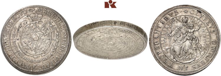 "BAYERN, HERZOGTUM, SEIT 1623 KURFÜRSTENTUM, SEIT 1806 KÖNIGREICH: Maximilian I. 1598-1651. Doppelter Reichstaler 1625, München. Mit dem Kurhut bedecktes, vierfeldiges Wappen mit Mittelschild, umher die Kette des Ordens vom Goldenen Vlies//Madonna mit Zepter in der Rechten und dem Kind auf dem linken Arm sitzt v. v. auf Mondsichel, umher Strahlenkranz. Feine Patina, kl. Schrötlingsfehler, vorzüglich. (Germany, electorate of Bavaria, Maximilian I, 1598-1651, double thaler of 1625, Munich mint. With the title of elector, quartered arms with central escutcheon and the chain of the Order of the Golden Fleece; reverse: Madonna and Child with scepter in a glory. Fine patina, some hairlines, extremely fine.)"