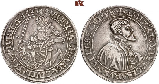 "LÜBECK, STADT. Taler 1537, mit Titel Karls V. und Abzeichen des Bürgermeisters Nicolaus Brömse. Dritter Brömsentaler. RR Hübsche Patina, winz. Sammlerzeichen, sehr schön +. In der Vorderseitenumschrift dieses seltenen Talers mit dem Porträt Kaiser Karls V. ist eine Stechfliege ("Bremse") zu sehen, das "redende" Wappen des Bürgermeisters Nicolaus Brömse. (Germany, city of Lubeck, thaler of 1537, in the name of Charles V and the badge of mayor Nicolaus Brömse. Rare, nice patina, very fine or better. The obverse of this rare thaler shows a biting fly--bremse--a pun on the mayor's name.)"