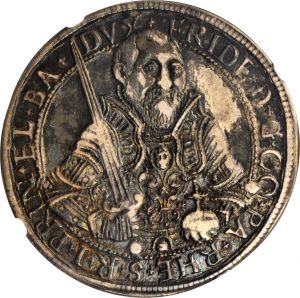 This specimen was lot 682 in Stacks-Bowers NYINC sale (New York, January 2015), where it sold for $1,527.50. The catalog description[1] noted, "GERMANY. Pfalz-Simmern. Taler, 1572. NGC EF-45. Toned with hints of rose, green, and pearl hues. Some wear, but an overall appealing piece. From the Rockaway Collection." The Palatinate, on the border with France, was divided several times. The Pfalz-Simmern line, founded 1410, expired in 1685 and the county passed to Pfalz-Neuburg.