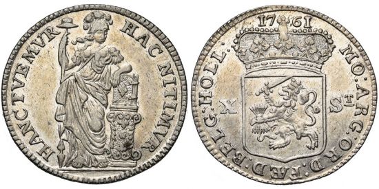 "NEDERLAND, HOLLAND, Provincie, AR 10 stuiver (Nederlandse halve gulden), 1761. Vz/ Staande maagd met speer en vrijheidshoed. Kz/ Gekroond Generaliteitswapen. bijna Prachtig. (Netherlands, province of Holland, silver ten stuivers or half gulden of 1761. Obverse: standing maid with spear and pillar; reverse: crowned arms of the Generality. about Extremely Fine.)"